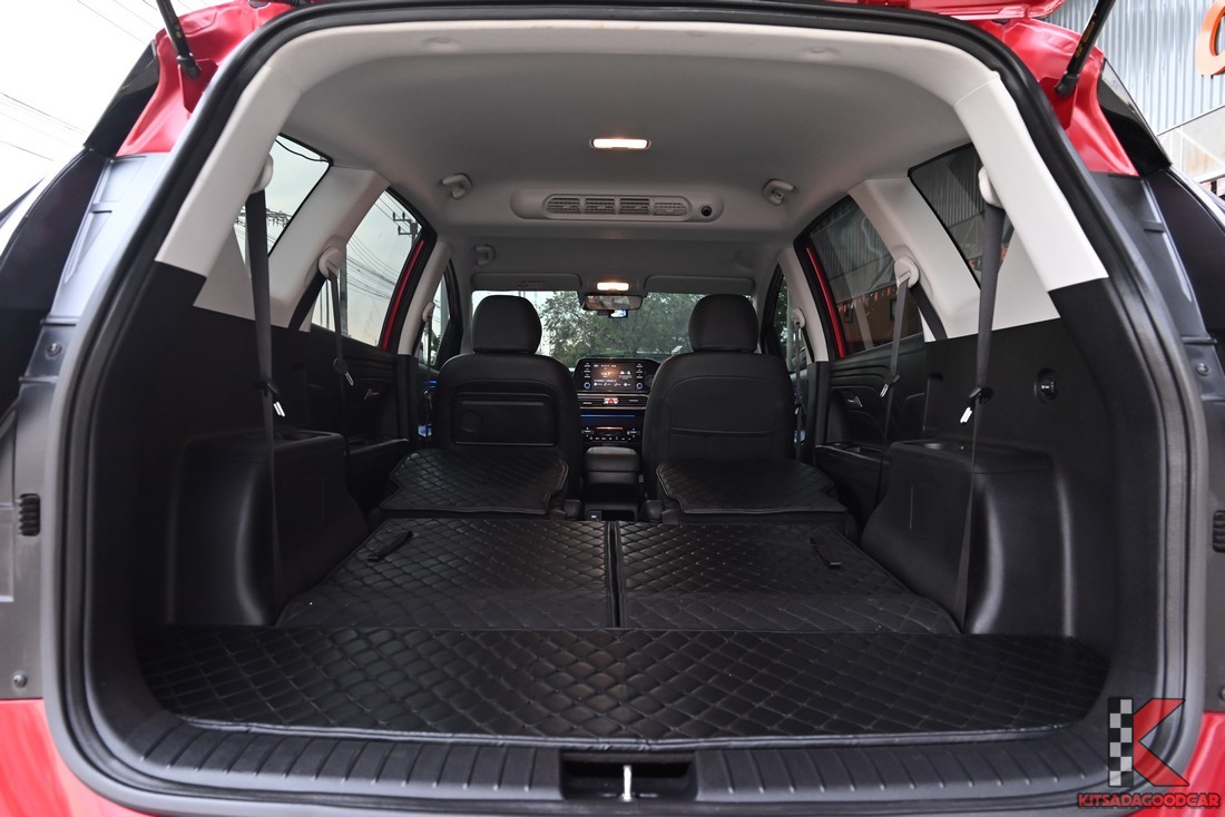 ความจุ: 200 - 585 ลิตร (เมื่อพับเบาะ) การใช้งานจริง: ช่องทางเดินตรงกลางเบาะแถว 2 วางของยาวได้ (ร่ม/ไม้กอล์ฟ) เมื่อพับเบาะแถว 3 พื้นที่จะราบเรียบ ใส่กระเป๋าเดินทางใหญ่ได้ 3-4 ใบ